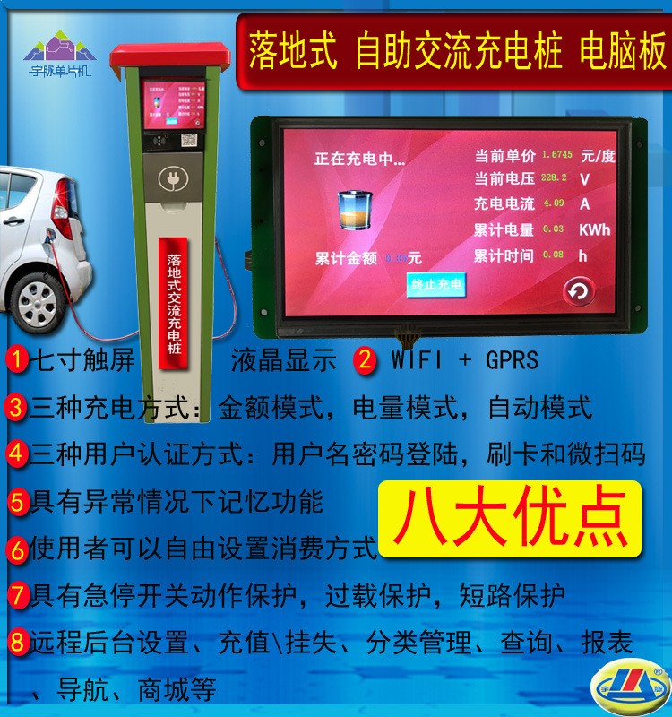 充电桩器功能类似于加油站里面的加油站,可以固定咋=在地面或墙壁,安装与公共建筑(公众楼宇、大型商场,公共停车场、其实也单位等)和居民的小区停车场或充电站内,可以根据不同的电压等级为各种型号的电动汽车充电。充电桩的输入端与交流电网直接连接,输出端都桩有充电插头用于为电动汽车充电。充电桩一般提供常规和快速充电两种方式,人们可以使用特定的充电卡在充电桩提供的人际交互操作界面上刷卡使用,进行相应的充电方式、充电时间、费用数据打印等操作,充电桩显示屏能显示充电量、费用、充电所用的时间等数据。